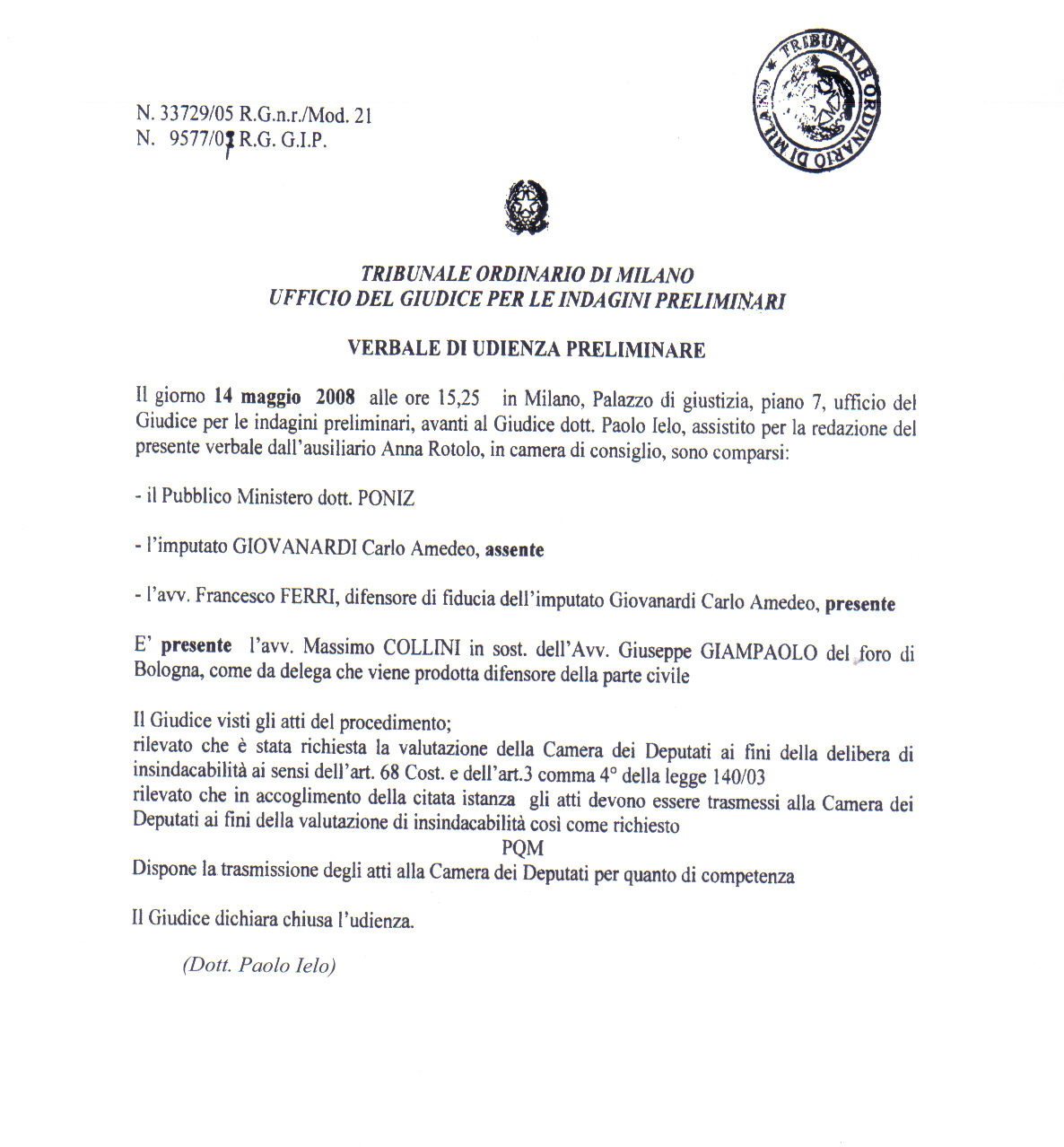 Thursday, 26 June 2008Oggi sulle prime pagine dei giornali fa bella mostra l’ex Ministro, attualmente sottosegretario, Carlo Giovanardi. “I parlamentari sniffano coca”, ha dichiarato. E sai che novità? Poi ha corretto il tiro “A mio parere è plausibile che in tutto il Parlamento siano al massimo dieci, tra deputati e senatori, quelli che possono avere familiarità con la droga”. Eppure Giovanardi dimentica di dire che è indagato per diffamazione a mezzo stampa (parte civile l’avvocato Collini di Bologna, noto per essere il rappresentante dei familiari delle vittime della strage di Bologna) e, per evitare il giudizio, ha chiesto l’insidacabilità delle proprie opinioni e il Gup di Milano, Paolo Ielo, ha dovuto rimettere gli atti alla Camera dei Deputati. SOTTO IL DOCUMENTO FIRMATO DAL GUP (CLICCA “LEGGI TUTTO”).