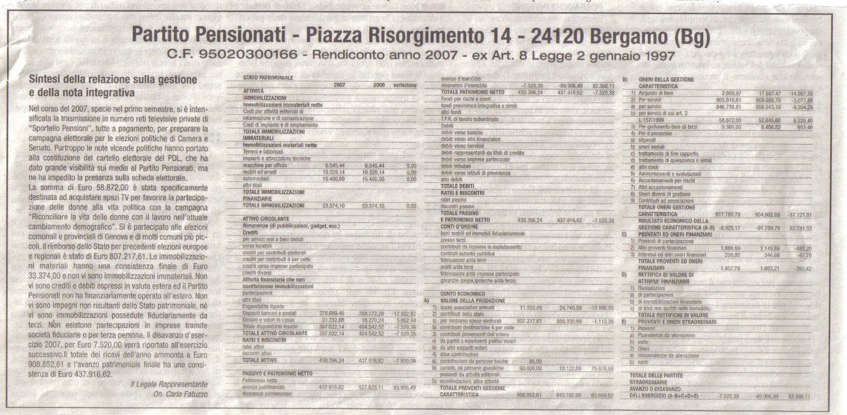 analizzando il bilancio sembrerebbe emergere invece che negli ultimi due anni il Partito dei Pensionati ha speso più di quanto incassato; infatti nel 2007 ha evidenziato perdite per circa Euro 7.500 e nel 2006 perdite per Euro 90.000. E come vedrà i soldi in banca sono diminuiti nell’ultimo esercizio.