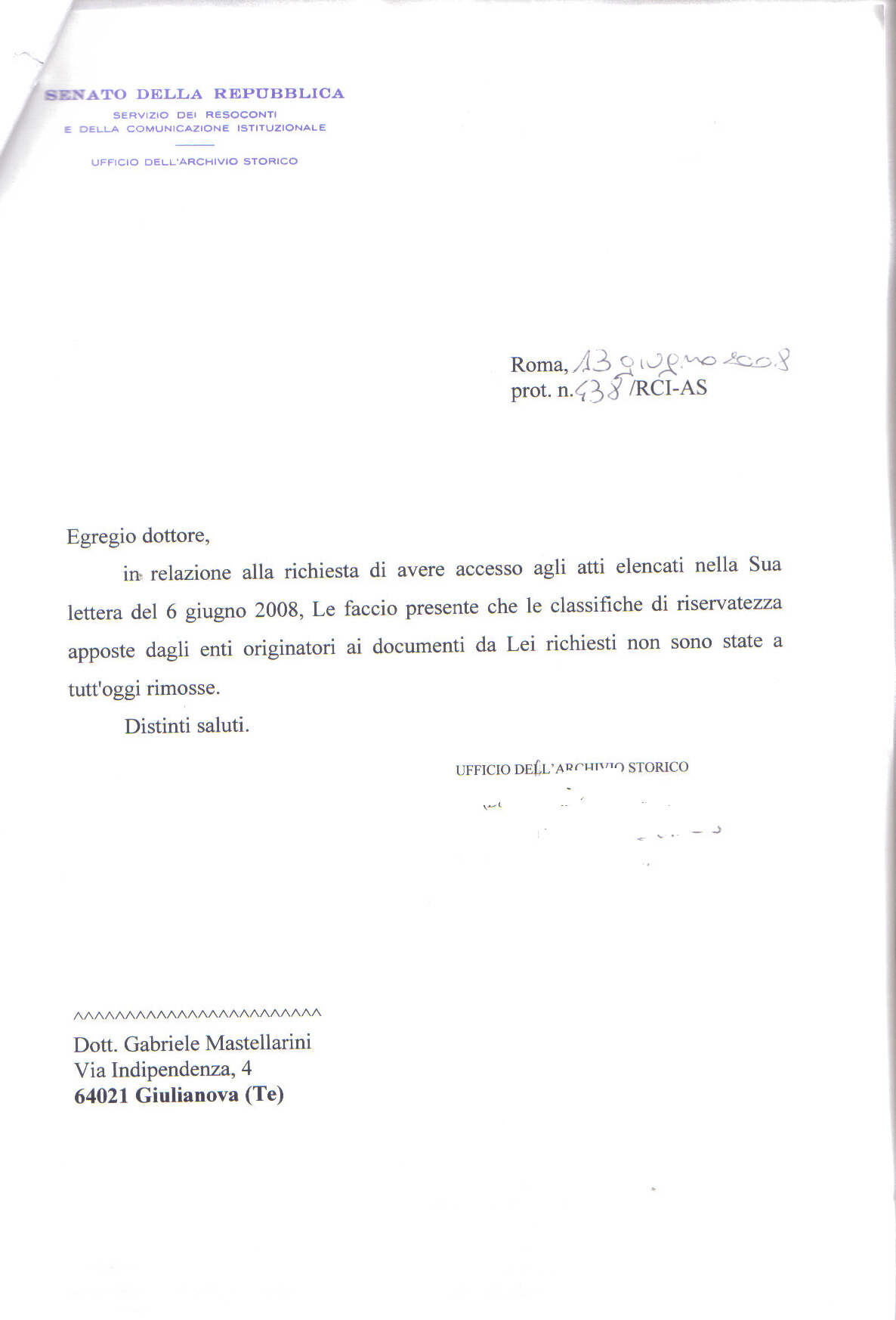 Così il 6 giugno ho scritto la mia domanda all’Archivio del Senato, ma come vedete dall’allegato mi hanno risposto picche, perché “le classifiche di riservatezza apposte dagli enti originatori non sono state a tutt’oggi rimosse”.